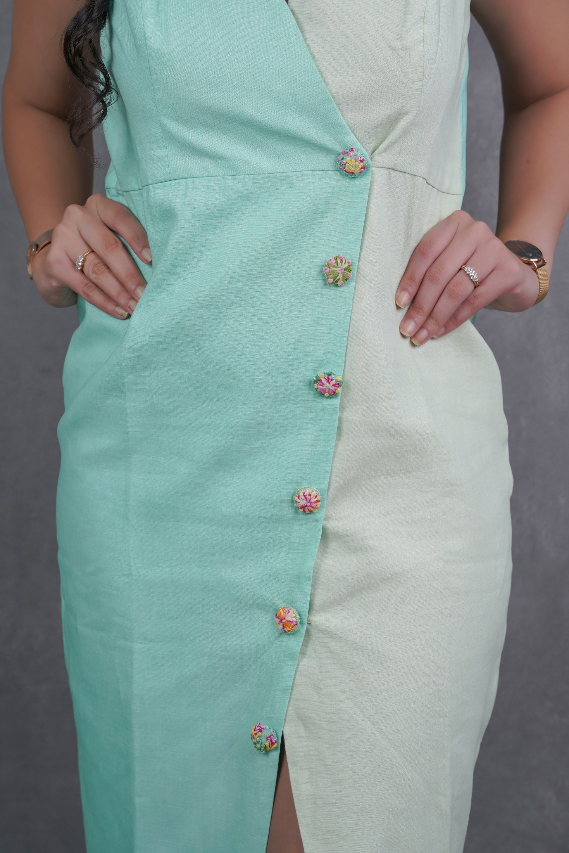 A breezy dual-tone pure linen dress with floral button details and a chic front slit. Fresh, playful, and perfect for sunny days or resort getaways.