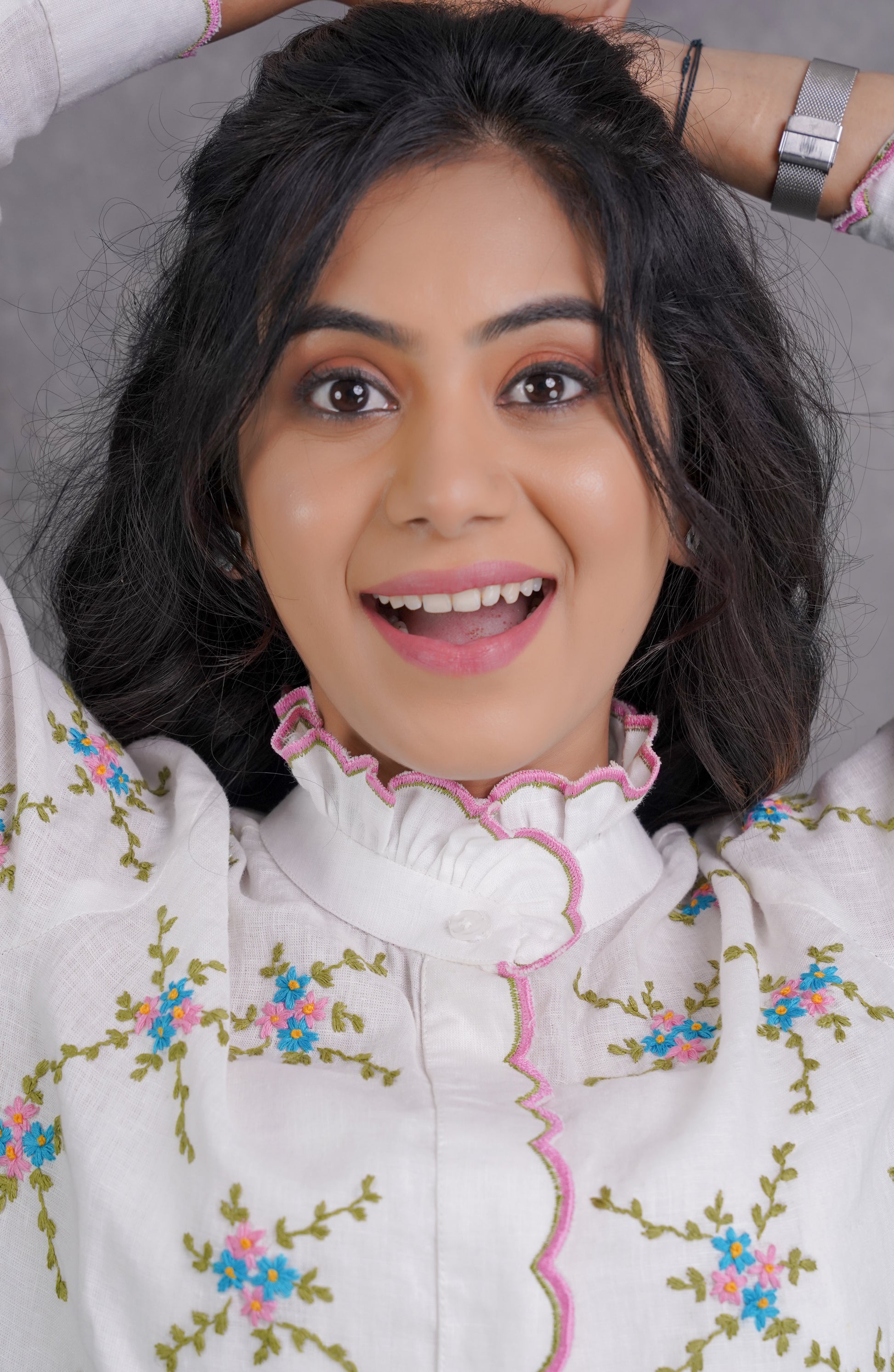 Crafted from pure linen, this white shirt is adorned with delicate all-over floral embroidery in soft blue and green hues. The scalloped front placket with subtle pink edging adds a touch of playful elegance, making it a perfect blend of breezy comfort and artisanal charm.