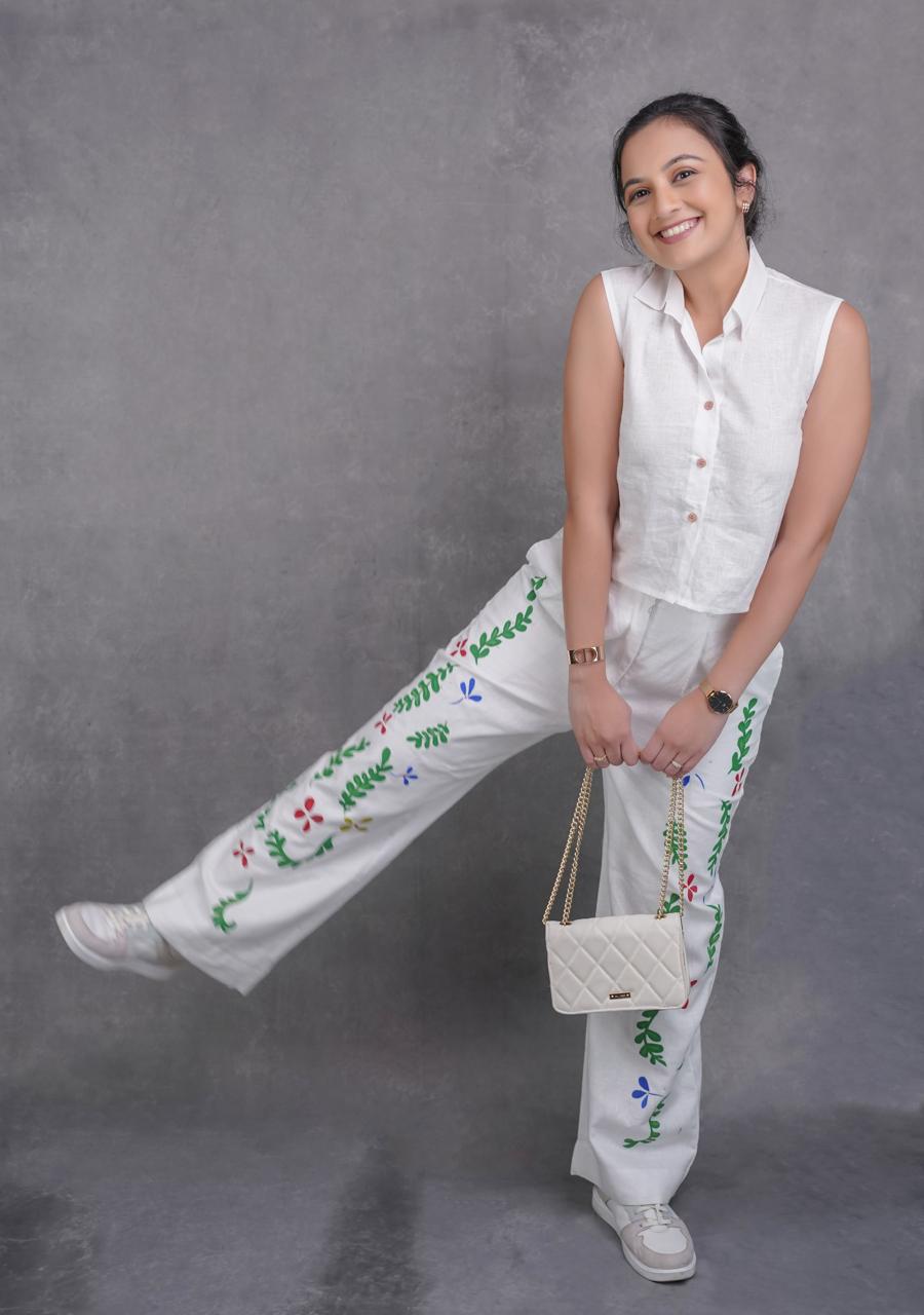 Step into sunshine with the Meadow Stroll Trousers — a pair of relaxed-fit pure linen pants hand-painted with playful floral vines in vibrant hues. Light, breathable, and full of personality, these trousers blend artisanal charm with everyday comfort. Perfect for brunch dates, beach vacations, or just adding a pop of joy to your casual closet.