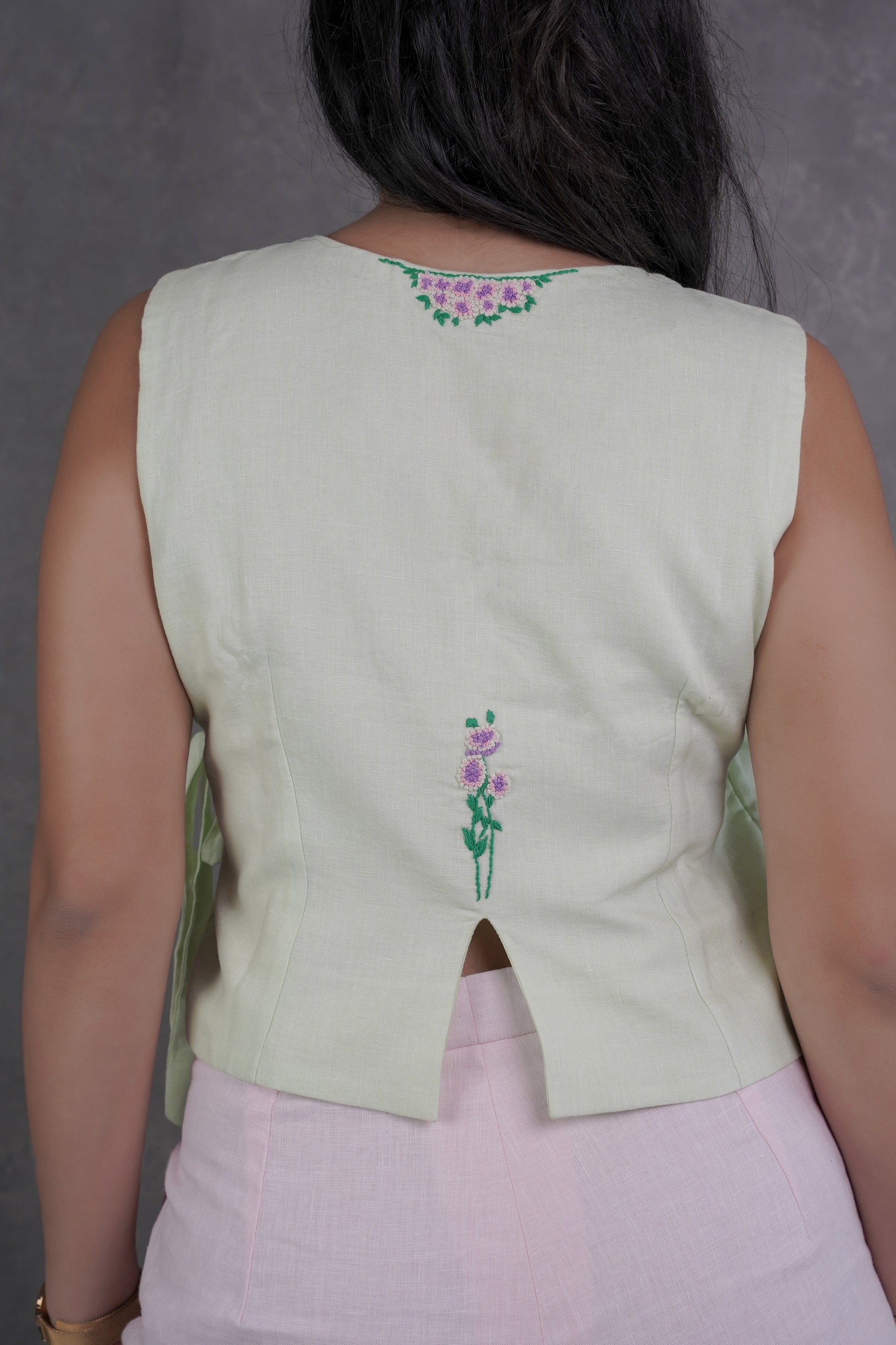 Fresh, feminine, and effortlessly stylish — the Mint Flower Wrap Top is a sleeveless pure linen piece with a flattering tie-up silhouette. Adorned with hand-embroidered floral motifs in soft purples and greens, this pastel mint beauty adds a gentle charm to your everyday or resort wardrobe. Pair it with wide-leg trousers or flowy skirts for a breathable, elegant summer look.